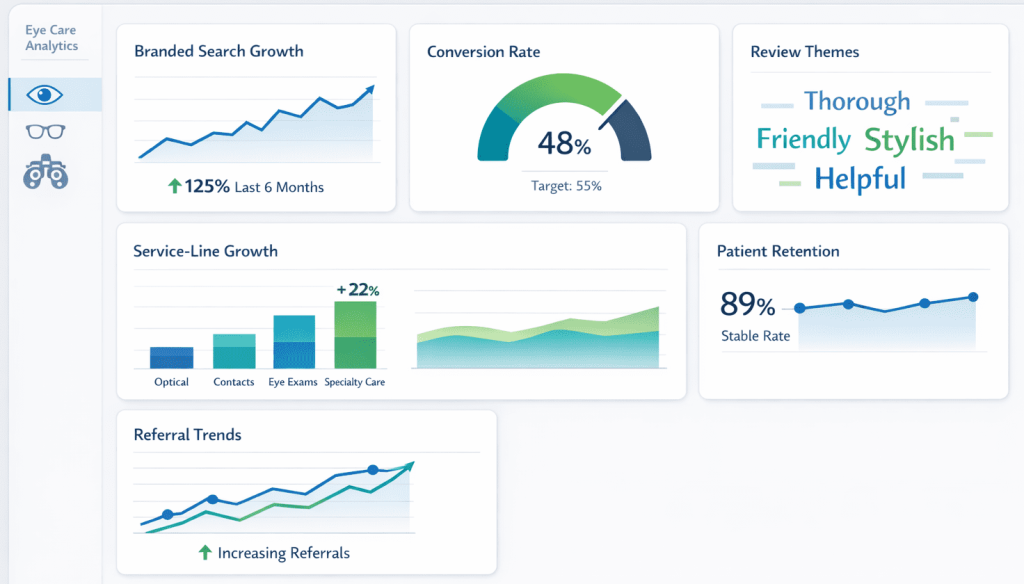 Then look at business metrics. Watch conversion rates on key landing pages, appointment mix by service line, no-show rate, retention, referral patterns, revenue per patient, and branded search activity in your analytics platforms. If your positioning says you are the area’s go-to destination for specialty contact lenses, but most new patients still arrive for basic routine exams and mention low price, your position is not fully landing.