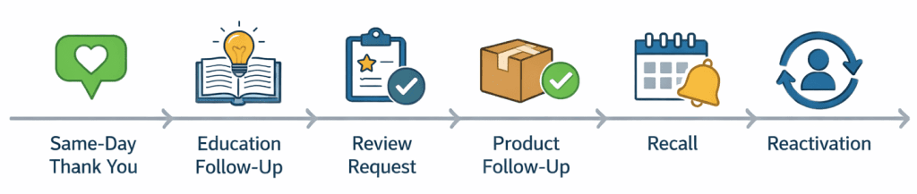 For eye clinics, that means building a post-appointment sequence that is useful, segmented, timely, and compliance-aware. A thank-you email creates clarity. Educational follow-up improves adherence. Review requests strengthen reputation. Recall emails protect retention. Relevant product follow-up supports revenue without undermining trust.