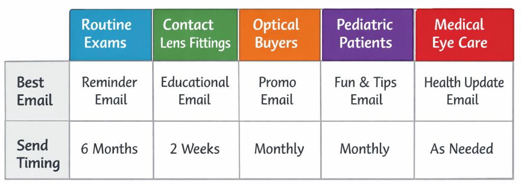 These segments change both the content and the timing of the email. A new patient may need more orientation and reassurance. A returning patient may need a faster route to rebooking. A contact lens patient may need replenishment and wear reminders. A pediatric family may need parent-centered instructions.